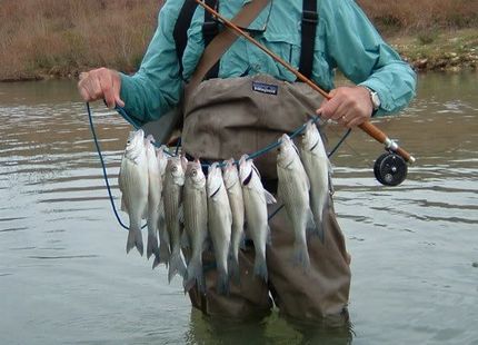 Striped bass or "Stripers" are a well known game fish here in north Texas. The Fish is naturally androgynous meaning that it lives part of its life in fresh water and part of its life in salt water. Its natural life cycle is to spend its adult life in the ocean and return to rivers for spawning much like salmon. It was discovered while creating reservoirs on the east coast that Stripers could survive and even thrive in fresh water when they were cut off from the sea. Stripers are a close relative of White Bass and can be fished for in lakes much the same way. There are also many lakes that are stocked with "Wipers" which are a Striped Bass, White Bass hybrid. Lake Texoma is one of the few places in the US that land locked Stripers have established a sustained breeding population. This now native population in the lake creates a unique opportunity to target the fish in the tailwaters directly below the dam. When the flows are right it is one of the best opportunities in the area to land a +10 pound fish on a fly rod. This fishery is highly subject to flows from the dam and as a result trips are short notice only and plans are often subject to change.